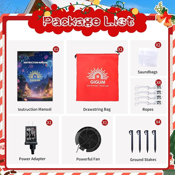 - 【Sturdy Installation Design】: Stays stable in wind! This christmas blow up comes with 4 ground stakes, 3*2-meter ropes, and 2 sandbags. Fill sandbags, place inside before inflating—the Inflatable Gingerbread Man stands strong. Enjoy inflatable christmas decorations with peace of mind!