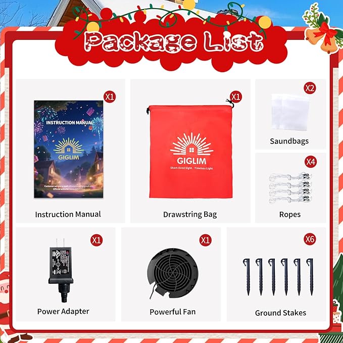 - 【Sturdy Installation Design】: Stands strong even in the wind! This christmas blow up comes with 6 ground stakes and 4*3-meter pull ropes—use them to secure the inflatable christmas yard decorations firmly to the ground. We also include 2 sandbags: fill with sand and place inside before inflating, and the Inflatable Gingerbread Man will stand against the wind like a pro. No tipping worries—enjoy your inflatable christmas decorations with total peace of mind!