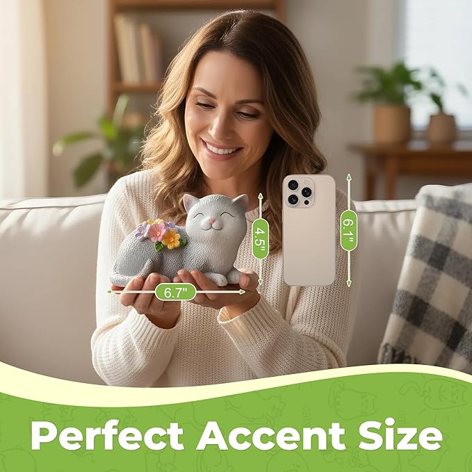 - CHARMINGLY SIZED FOR ANY SPACE: Measuring 6.7"L x 4.5"W x 4.5"H, this charming cat figurine is purposefully designed to be a tasteful accent in any space. It’s the perfect size for nestling among flower bed decorations, perching on a porch rail, or adding a touch of whimsy to your balcony, creating a delightful focal point without overpowering your garden