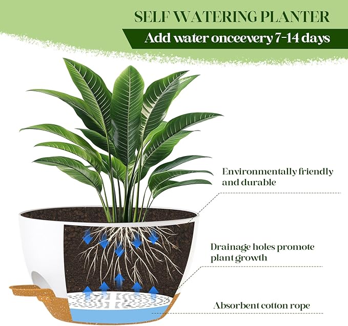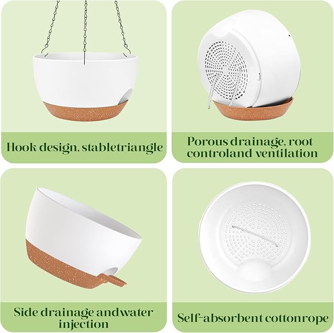 - ✅ 2 Large Self-Watering Planters: Double the value! Includes two 10-inch wide plastic hanging planters with built-in self-watering reservoirs to reduce the need for frequent watering and keep plants healthier.
