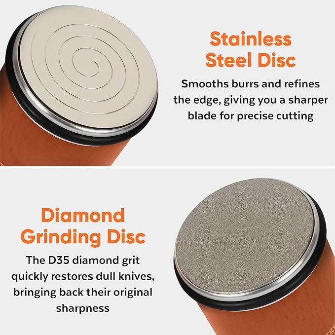 - 2-Stage Sharpening System - The 400 grit diamond disc restores dull edges and the 3000 grit Stainless Steel disc smooths and refines for a razor-sharp finish, perfect for maintaining high-performance kitchen knives.