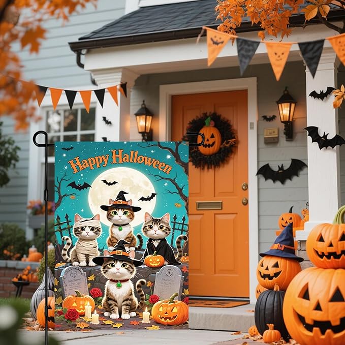 - Special Halloween Design: Four costumed cats take center stage in this charming seasonal scene, each playfully dressed as a mummy, witch, or vampire. Surrounded by jack-o'-lanterns, roses, bats, and gravestones, the design creates a lighthearted haunted setting. The whimsical style captures the festive essence of Halloween and adds delightful personality to fall decorating themes at home.