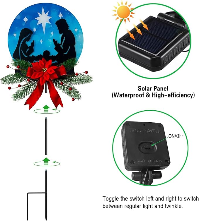 - 【Christmas Decor】 Classic nativity scene with Jesus, Mary, Joseph, and Bethlehem star, creates a warm, sacred atmosphere for your lawn, garden, or patio.Size:9.25"W*6"H*6“W*34.5”H