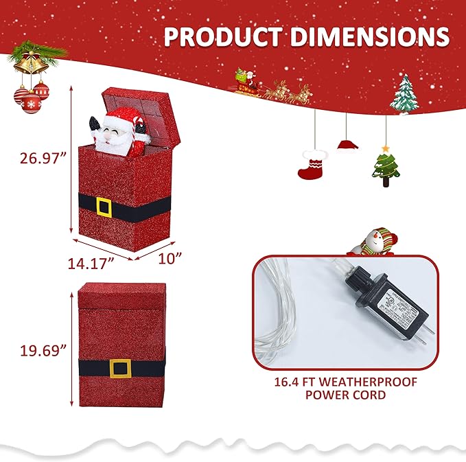 - Animated Santa Claus in Gift Box - This Electric Santa Claus decoration automatically moves up and down inside a festive gift box when powered, instantly bringing holiday cheer without any installation hassle. Just plug it in and enjoy the charming motion. The waterproof power cord ensures safe and reliable use in your outdoor setups.